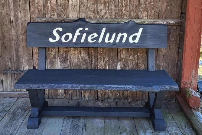 Handgjord träbänk med rustik karaktär i en tidlös design. Den här bänken är ett kraftfullt exempel på äkta hantverk, tillverkad från grunden i massivt trä bearbetat för hand. Bänken fungerar både som en stabil sittmöbel och ett vackert inslag i ditt hem eller i trädgården. Går även att få en egen text infräst på ryggstödet.