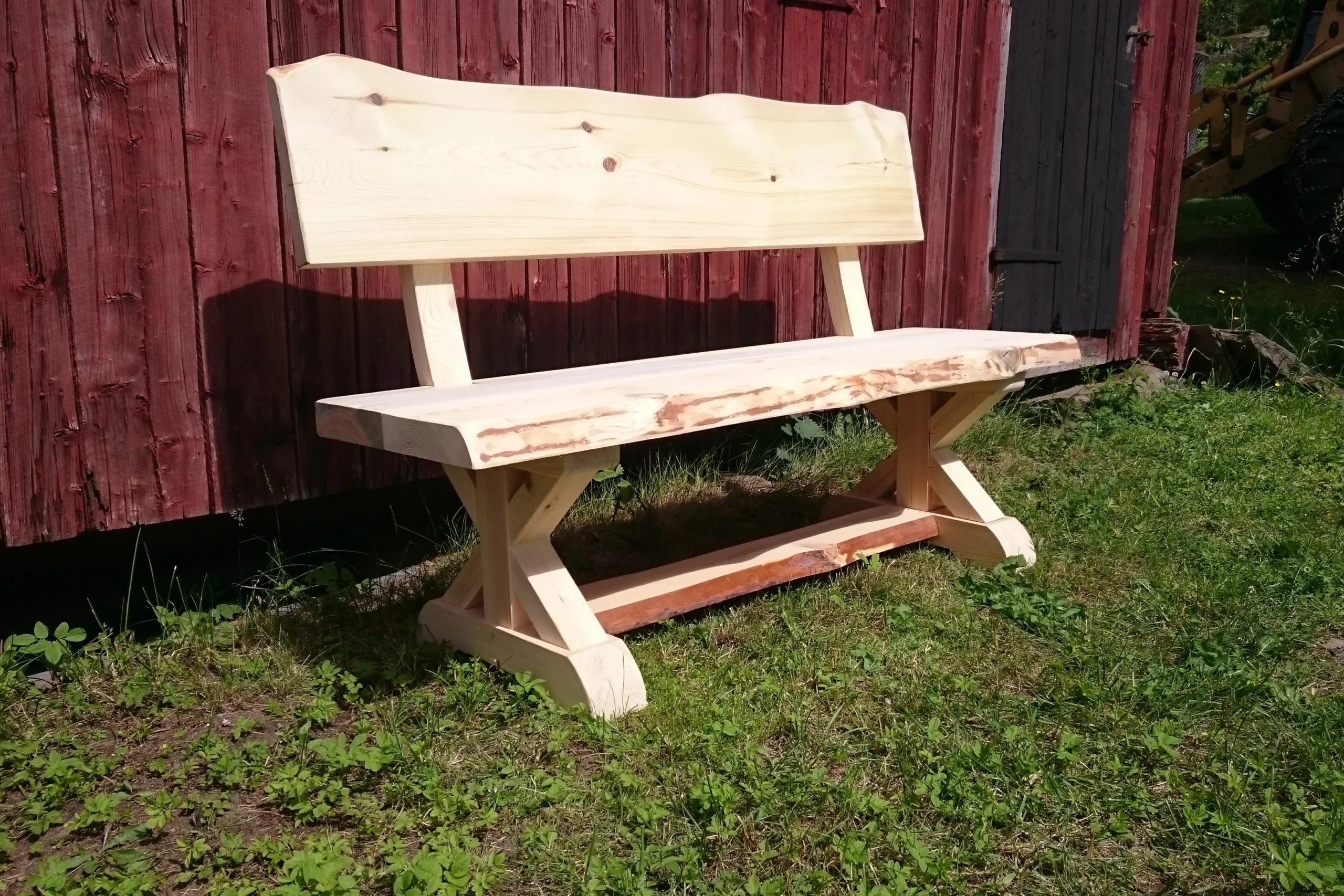 Handgjord träbänk med rustik karaktär i en tidlös design. Den här bänken är ett kraftfullt exempel på äkta hantverk, tillverkad från grunden i massivt trä bearbetat för hand. Bänken har en snygg variant av kryss i underredet och ingår i serien Lofsdalen. Passar lika bra vid ett matbord som på altanen eller i trädgården.
